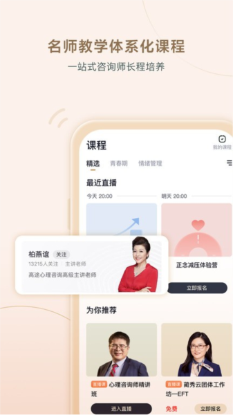平台汇集了各流派领域专家大咖,哈佛大学心理学博士、首都师范大学教授岳晓东,原北大哲学系教授高云鹏,北京师范大学心理学部教授、博士生导师蔺秀云等,为学员提供专业课程。