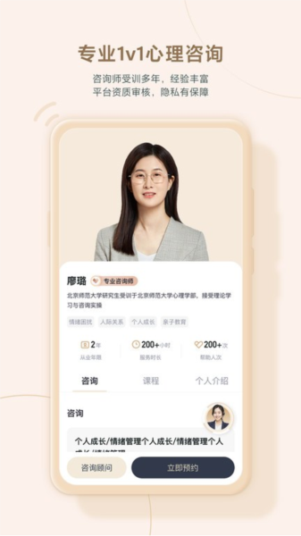 【1v1专业咨询】一键预约专业咨询师,适合恋爱婚姻、情绪压力、亲子育儿、职场发展等各类问题,线上或线下,多种选择,助您纾缓人生困扰,打造幸福人生。