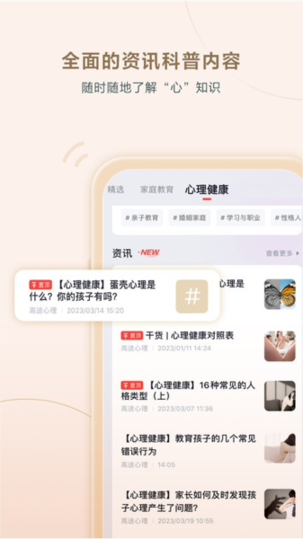 【资讯资源】平台自有的资讯资源板块提供专业免费的行业资讯及心理健康、家庭教育、情绪管理等科普内容。