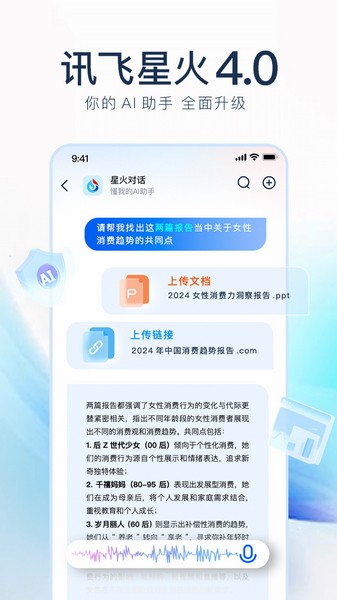 讯飞星火app是一款由科大讯飞开发的免费人工智能工具,主要帮助用户提高工作效率和生活便利。它支持多种功能,包括一键生成各种文案、PPT,还能处理文档、翻译、润色甚至编写代码。软件通过不断学习海量数据来提升性能,在多个领域都有出色表现。