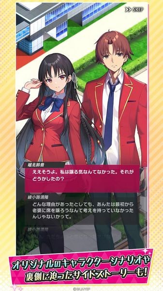 欢迎来到实力至上主义的教室是一款二次元漫改休闲消除手游,游戏根据日本热门动漫《欢迎来到实力至上主义的教室》改编而来,游戏中有很多大家熟悉的角色,比如绫小路清隆、堀北铃音、栉田桔梗、轻井泽惠等等,超豪华声优配置,超简单上手游戏玩法,快来下载试试吧!
