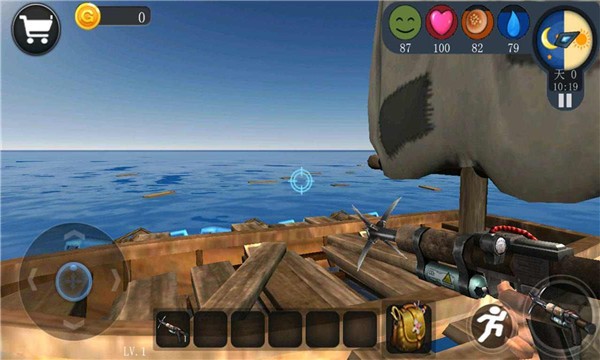 1、进入游戏后,点击“新游戏”开始,玩家将出现在一条小船上,需要使用手中的标枪来获取物资。将准星对准木箱或浮木,长按右下角的图标发射即可。