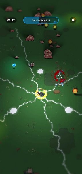 3、应对挑战,活用范围伤害技能(如闪电)控场,移动规避伤害,坚持到倒计时结束。
