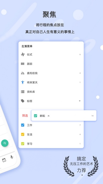 耕耘十年来广受信赖,原汁原味遵循《搞定无压工作的艺术》书中的GTD时间管理黄金标准,帮助你战胜拖延