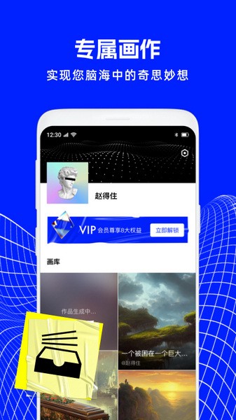 智能绘画工具,基于强大的AI智能技术,能够让用户脑海中的奇思妙想,变成肉眼可见的艺术图片,只需几秒钟,就能得到一幅专属个人的画作。在APP中随意输入一个关键词或一段描述,再选择一种艺术风格,选择一位艺术家,点击“生成画作”,瞬间就能变成创意十足的画作。