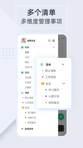 - 日历视图:按月或按周查看任务清单,方便进行周计划和月度规划,复盘过去,专注当前,规划未来。