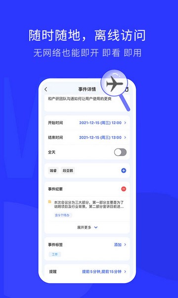 WOLB软件App是一款专业实用且功能十分全面的手机日志提醒软件,在这里,不仅支持多种视图实时查看,无论是日、周亦或是月、事件列表等都可随你多个终端同时登录使用,并且能够切换各种设备,而且上下拖动即可快速调整事件起止时间,让你的每日安排一目了然,除此职位,这款软件还支持时间添加标签,相关标签也可自行增删改查。