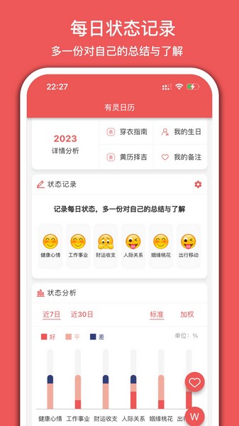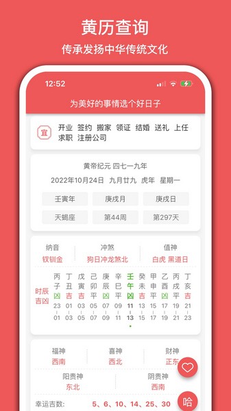 有灵日历根据用户输入的生日信息,输出用户专属的黄历与宜忌信息。