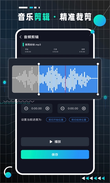 简单,现代和易于使用的用户界面,精确地削减您的音频(高达100毫秒)歌曲的最佳部分,用于音乐文件,手机铃声,通知,闹钟