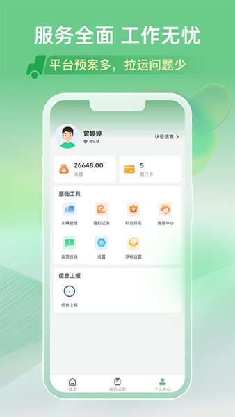 1、打开软件中司机就可以在线认证身份信息,能够在这里获取货单资源;