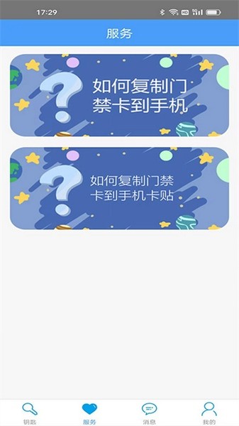 3、服务页面,有如何复制门禁卡到手机等教程卡片,底部导航栏能在钥匙、服务等模块切换。