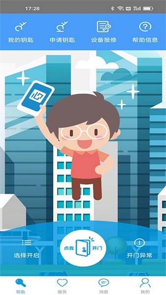 1、主页面,有我的钥匙等功能,中间点我开门按钮,底部导航栏可切换钥匙、服务等模块。