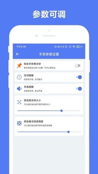 支持用户打开锁定手势的悬浮球进行使用,还能这对悬浮球进行参数设置。