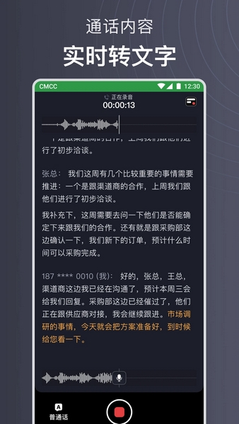 3、通话内容实时转文字,不管是传统通话方式还是网络通话方式都能把通话内容转换为文字;