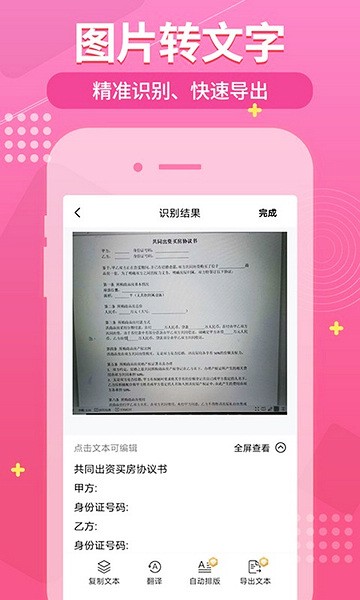 3、集OCR扫描,文字识别,表格识别,证件识别等为一体的手机端实用工具,让图片转文字识别校对变得更加简单便捷。