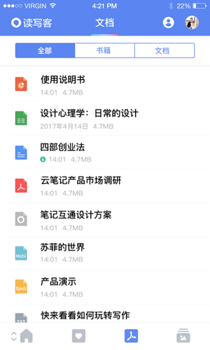 3、文档:文件传输,非常方便 。可以直接将办公文件,电子书等上传至读写客,办公本、PC、手机三端同步查看,支持word、ppt、pdf、epub等文件格式;