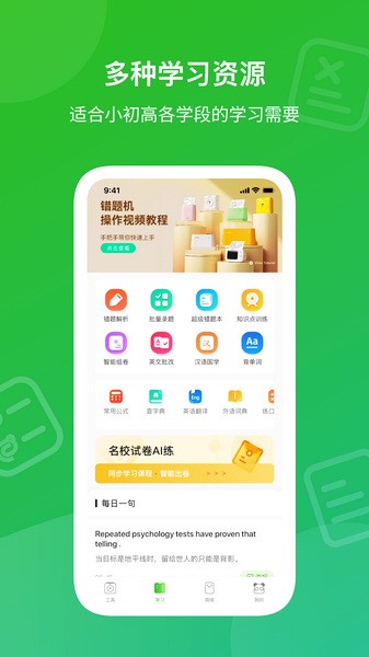 爱立熊是一款集学习、办公和社交为一体的综合性APP,这里有小初高非常全面的学习内容,包含上亿题库,并且每天更新数千道新题。学生们还可以将错的题目进行拍照保存,方便以后进行回顾,还可以将其打印出来,学习更加效率。同时软件中还有其它多种打印功能,支持办公文档、图片、网页等内容的打印。此外用户还可以在这里写自己的待办事项,还能将各类素材上传分享,如果有喜欢的用户还可以对其进行关注。