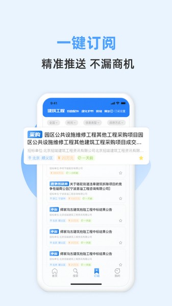 软件功能挺全面,比如智能筛选公告、一键联系负责人、安全认证、云端同步数据和高效协作工具这些都很实用。特别是“订阅”功能,可以根据自己的需求定制推送,这样就不会错过任何商机了。