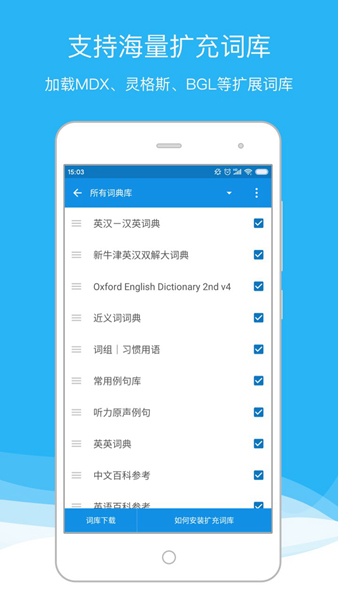 扩充词库:通过网络下载各语种的扩充词库,支持Mdict、灵格斯、Babylon等多种词典格式,覆盖医学、经济、工程、计算机等十余个领域。
