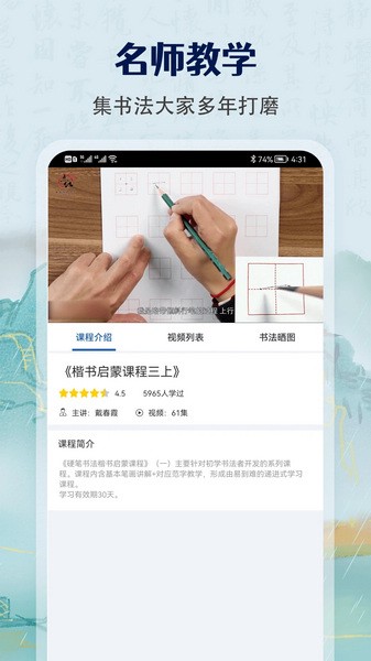 1、经典名师教学课程:“中国书法家协会”名师亲自传授书法教学课程,从一笔一画至力量美观,各阶段传授写字要领,满足各类人群对练字的需求。