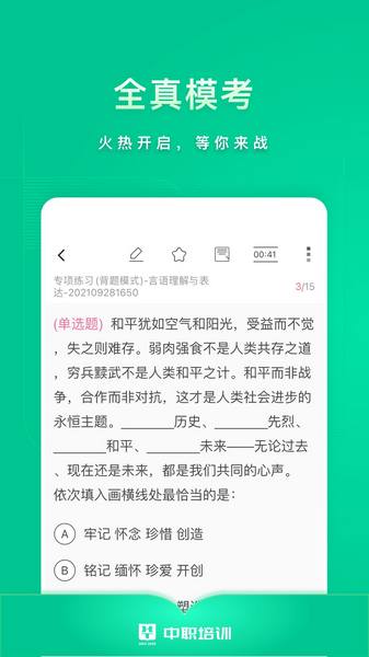 中职培训由老师人工组卷,供全体用户自测。老师的人工组卷相比纯机器更有针对性,在复杂的教育产品中,更体现出经验的重要性,全体小伙伴做一套题,才能得出真实的比较。