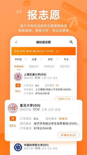 志愿填报:掌上高考的数据来源于官方机构和高校,权威、准确、及时,累计数据量已达数百万条。志愿填报主要包括:估分选大学,查学校,查专业,真假大学,海外大学等大学查询服务。上掌上高考,总有个大学适合您。