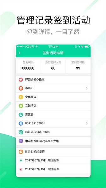 创建签到活动,通过审核后,便可对志愿者的签到签退进行记录。