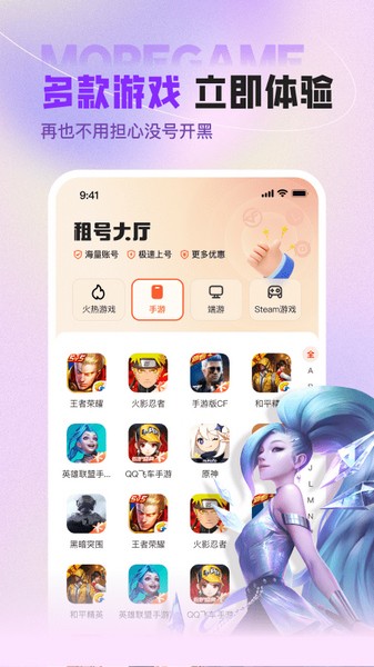 U号租登号器手机版是一款主打游戏账号租赁的软件,若是想要体验一把大神账号的快乐,那么不如使用这款软件租借心仪账号吧!其汇集了海量优质账号可供玩家进行挑选,且类型覆盖相当之广,囊括了端游、手游、游戏平台、加速器、影视、音乐等账号,让你轻松享受高级账号!在挑选完毕后一键即刻下单,专业客服24小说为你提供租号服务,轻松享受优质账号!
