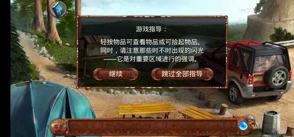 -看完开始的剧情后进入游戏,点击帐篷进入寻找物品,完成后得到“车钥匙”;用车钥匙打开车的后备箱得到“拖绳”;