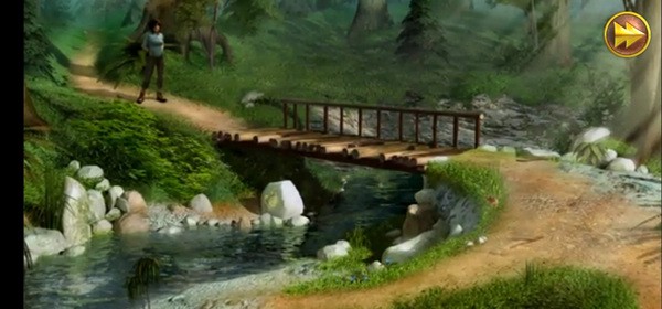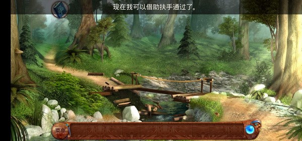 -来到毁坏的桥边,把“拖绳”绑在桥的两头,这样就可以过桥了;