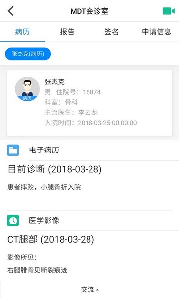 划分多样的MDT会诊室资料栏目,其中有病历、报告以及签名和申请信息栏目;