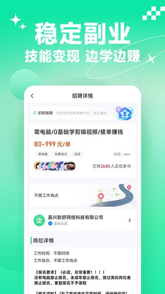 4、网罗了大量的真实的兼职招聘,确保了所发的工作内容的真实性,给了使用者更多的安全感。