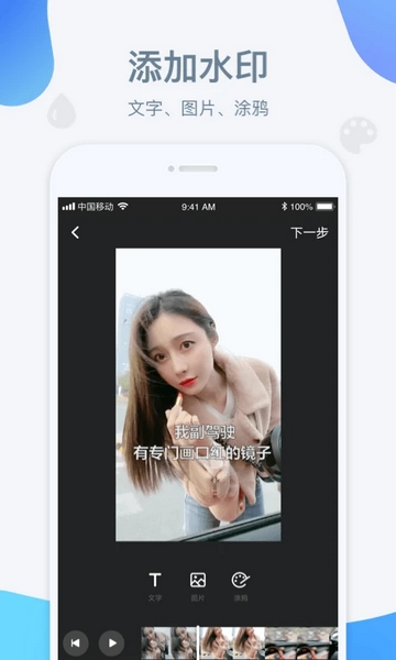 2、进入之后将图片、水印素材等添加上去,然后按照需求选择透明度,在点击下一步就完成了!