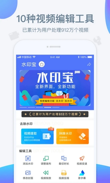 并拥有多种视频编辑功能,支持加水印、去水印、视频裁切、视频剪辑、视频修改封面、视频倒放、视频压缩、视频变速,等功能。