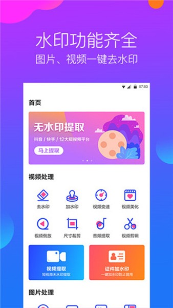 2、进入主页界面,有图片加水印、视频家水印、视频无水印提取等功能。