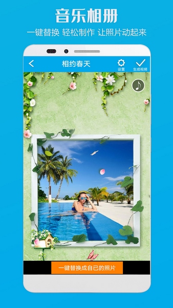 4、对于婚纱照,宝宝照,旅游照,朋友聚会,成长记录,自拍等不同场景我们提供了针对性主题动效;每个 转场与每个动画根据主题伴随着音乐的节奏
