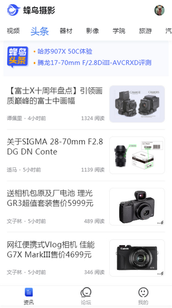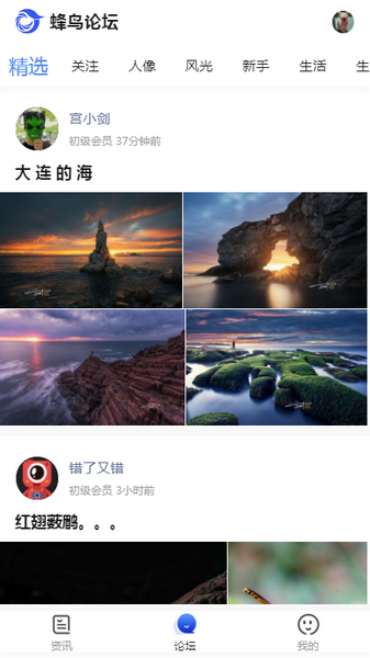 1.下载并登录蜂鸟摄影app之后点击首页下方的【论坛】按钮。许多用户会在这里发布自己的摄影作品。