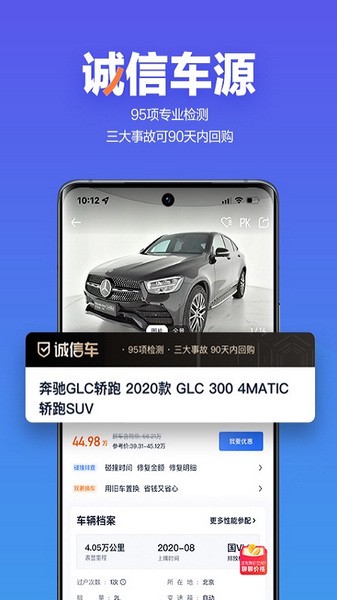 1、诚信车重磅升级,3大权益保障,95项专业检测放心车源,三大事故90天回购。