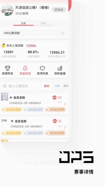 DPS赛鸽查询是一款专注于赛鸽管理的软件,软件致力于提供实时定位追踪等功能,帮助用户了解赛鸽的健康状况并提升养鸽技能。软件可以确保用户第一时间获取赛鸽动态,保持赛鸽处于最佳状态,并方便用户查找相关比赛信息,鸽友宝包括比赛数据记录、奖金查询、成绩排名等,软件可以很好的满足不同用户的使用需求。