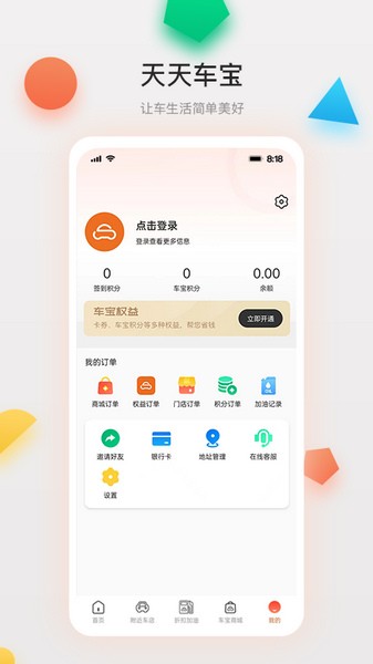 1、打开天天车宝app,有首页、附近车店、折扣加油、车宝商城和我的版块,首页有基础功能;