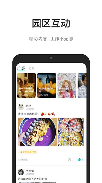 1、资讯:园区头条支持互动交流,活跃园区生活