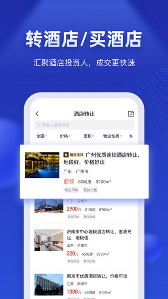 无论是想要了解酒店业的分类、出行热度,还是快捷查看所在城市的经营者信息,这款app都能满足你的需求。它还提供了酒店转让等一系列服务,包括品牌排行榜、大酒店转让等功能,帮助用户实现成交更快速的目标。