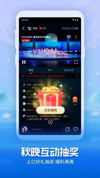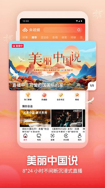 为用户提供中央广播电视总台电视直播和移动视频直播,也将呈现入驻社会账号发起的精彩直播内容。
