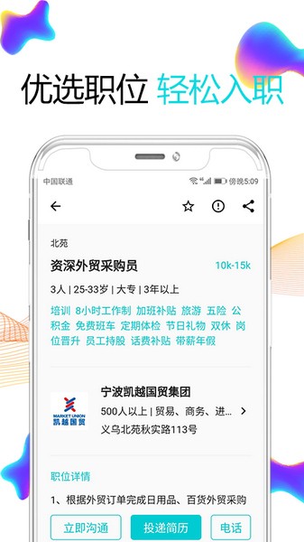2、提供了在线沟通的平台,即时高效的进行招聘或求职,并提供了常用语,一键即可发送。