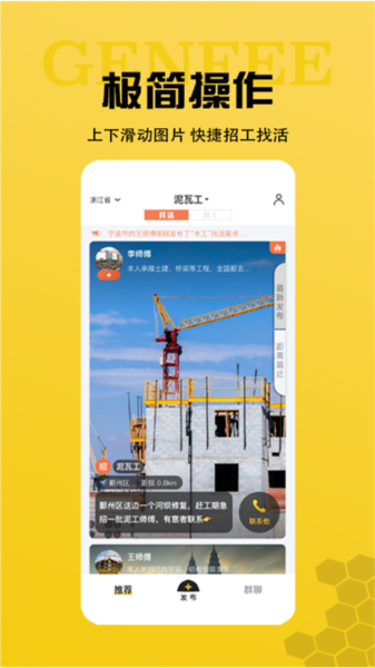 3、实时推荐:平台实时向用户推荐更好的工人、项目或者机械等,随意选择;