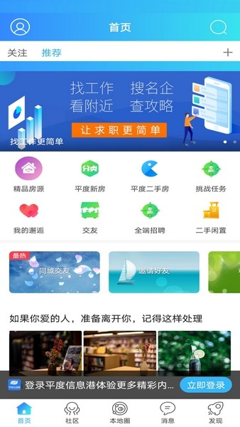 平度信息港是平度有人气和影响力的网络社交类平台;在这里特近市民生活可讨论本地热点资讯、八卦爆料;涵盖平度企业招聘、平度人才求职、平度房产信息、生活分类信息、聊天社交、平度探店等,致力于为平度人提供一个阅读、记录、分享、交流的网上互动家园,找到自己感兴趣的人脉等。