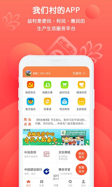 益村app是一款专门为广大农民们打造的智慧乡村综合服务平台,通过该软件用户们可以十分轻松的了解到村里各种各样的村务事项。同时,村干部上益村可以发布党务公开、村务公开,发起村民议事等等,村民们也可以查补贴、找工作、找对象、找工匠,学习农技知识、咨询各类生产生活问题等等,为大家生活带来更加便捷的服务。