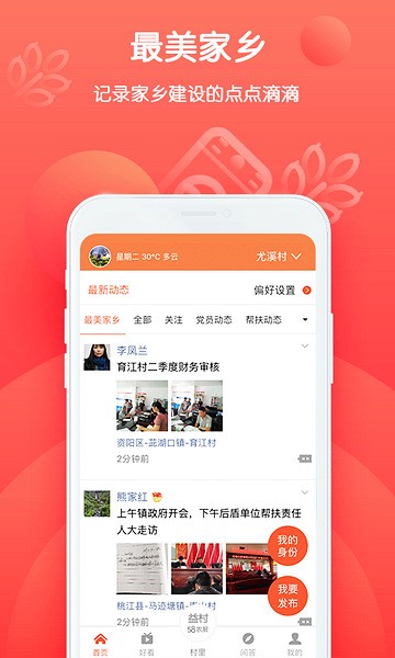 1、为用户提供动态版块,在这里用户能够看到自己村庄的各种建设动态,记录家乡的成长点滴;