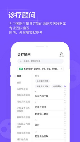 2、诊疗顾问:4000+条疾病的诊疗决策支持,覆盖90%临床常见疾病。内容涵盖基础知识、诊断依据、治疗原则、控制目标等核心诊疗环节,并提供疾病的「经典用药」信息查询,内容更实用,决策更安全。