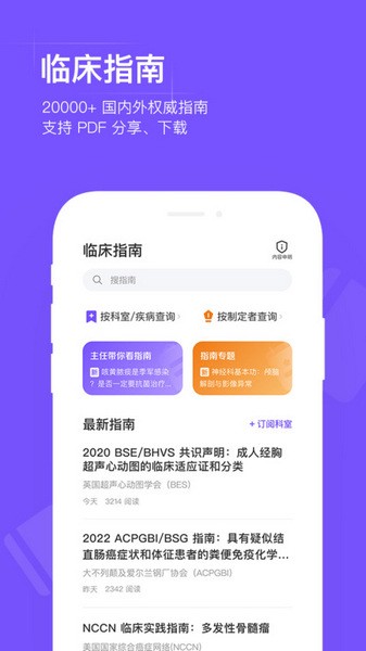 3、临床指南:收录20000+国内外权威机构发布的指南、专家共识,支持快速检索、在线查看,以及PDF分享或下载。